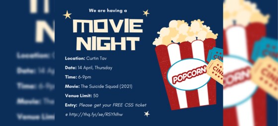 Movie Night @ The Tav Date: 14 April 2022, Thursday Time: 6pm - 9pm (film screening starts at 6:30pm) Entry: FREE (get tickets at http://thq.fyi/se/RSYhIhw) Movie: The Suicide Squad (2021) EVENT REQUIREMENTS: The space cannot exceed 50 persons. All attendees must be seated and wearing masks. Those entering the venue will be required to show proof of double vaccination and valid ID. CSS Movie Night Tickets MUST be claimed from http://thq.fyi/se/RSYhIhw Inclusions: Tav bistro reservation Movie Screening Kitchen open for snack menu and other movie snacks prior to movie screening (no BYO food & drinks) Full bar open 20 bean bags (additional BYO beanbags also allowed)